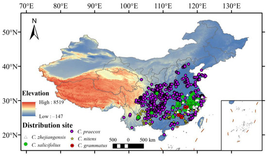 Species occurrence records were obtained from the Global Biodiversity Information Facility database (GBIF: https://www.gbif.org/, accessed on 13 May 2023), the Chinese Virtual Herbarium database (CVH: https://www.cvh.ac.cn/, accessed on 13 May 2023), the National Specimen Information Infrastructure database (NSII: http://nsii.org.cn/2017/home.php, accessed on 13 May 2023), and our field surveys.