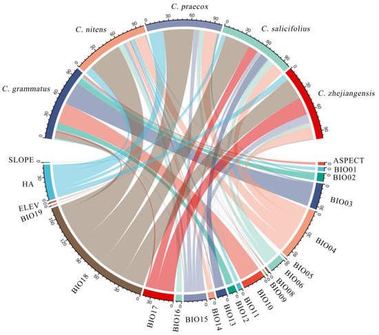 Chord diagram of the cumulative contribution of dominant climatic factors in Chimonanthus.