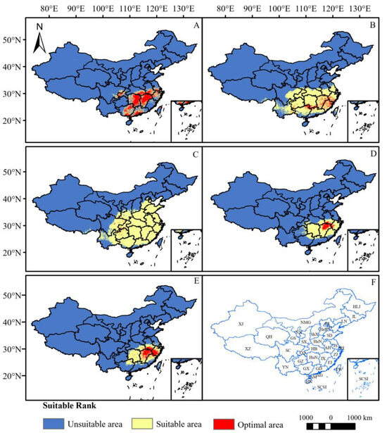 Potential distribution areas of five Chimonanthus species under current climate scenario. ((A): C. grammatus; (B): C. nitens; (C): C. praecox; (D): C. salicifolius; (E): C. zhejiangensis; (F): Distribution of administrative regions in China (XJ: Xinjiang Uygur Autonomous Region; XZ: Tibet Autonomous Region; QH: Qinghai Province; SC: Sichuan Province; YN: Yunnan Province; GS: Gansu Province; NMG: Nei Monggol Autonomous Region; NX: Ningxia Hui Autonomous Region; SX: Shaanxi Province; CQ: Chongqing municipality; GZ: Guizhou Province; GX: Guangxi Zhuang Autonomous Region; HN: Hainan Province; ShX: Shanxi Province; HeN: Henan Province; HB: Hubei Province; HuN: Hunan Province; GD: Guangdong Province; XG: Hong Kong Special Administrative Region; AM: Macao Special Administrative Region; AH: Anhui Province; JX: Jiangxi Province; HLJ: Heilongjiang Province; JL: Jilin Province; LN: Liaoning PRovince; BJ: Beijing; TJ: Tianjin; HeB: Hebei Province; SD: Shandong Province; JS: Jiangsu Province; SH: Shanghai; ZJ: Zhejiang Province; FJ: Fujian Province; TW: Taiwan; SCSI: South China See Island), the distribution of regions also applies to the other illustrations).