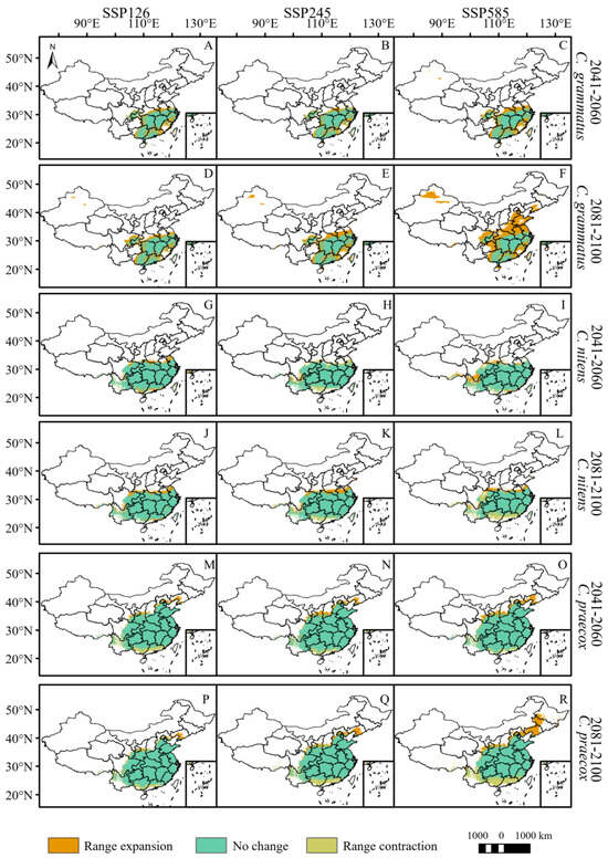 Potential range changes of C. grammatus, C. nitens, and C. praecox from near-current period (1970–2000) to future period (2081–2100) under three scenarios (SSP126, SSP245, and SSP585). ((A–F): C. grammatus; (G–L): C. nitens; (M–R): C. praecox).