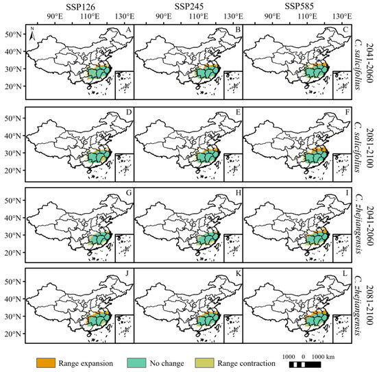 Potential range changes of C. salicifolius and C. zhejiangensis from near-current period (1970–2000) to future period (2081–2100) under three scenarios (SSP126, SSP245 and SSP585). ((A–F): C. salicifolius; (G–L): C. zhejiangensis).