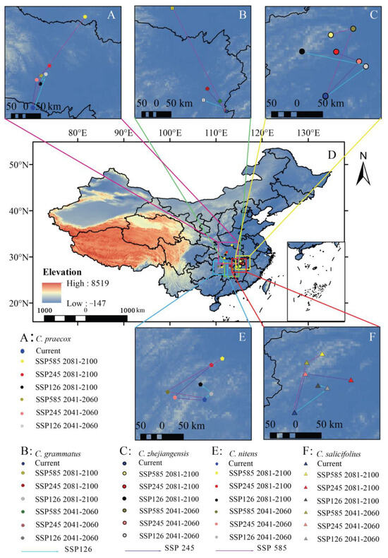 Distribution centroid of Chimonanthus under different climate change scenarios. ((A): C. praecox; (B): C. grammatus; (C): C. zhejiangensis; (D): Distribution centroid of five species in China; (E): C. nitens; (F): C. salicifolius).