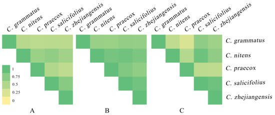 ENMTools is a set of comparative similarity measures and statistical tests that permit quantitative comparison and can be used to measure niche overlap among species distributions [30,36]. To quantify the similarity of niches among the five Chimonanthus species, ENMTools v1.3 software was used to calculate the interspecific niche overlap and range overlap in the near current [30,37]. The degree of niche overlap is represented by Schoener’s D(D) [38] and Hellinger-based I(I) [37] and quantified by comparing habitat suitability estimates calculated using Maxent-generated ENMs for each grid cell in the study area [30]. The D and I values range from 0 to 1, with higher values indicating greater niche overlap. The range overlap values also range from 0 to 1, and most scores mean more range overlap.