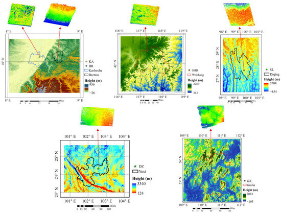 The study area includes six research plots, two of which are located in Bretten and Karlsruhe, Baden-Württemberg, Germany, and four in Saihanba, Hebei; Shangri-La, Yunnan; Central Yunnan; and Guilin, Guangxi, China. They are referred to as BR, KA, SHB, SL, DZ, and GX. The study areas exhibit diverse terrain with high vegetation coverage, characterized by a multi-layered distribution of trees, shrubs, and grass. There are significant differences in tree height, volume, etc. Their geographical locations and basic information are shown in Figure 1 and Table 1.