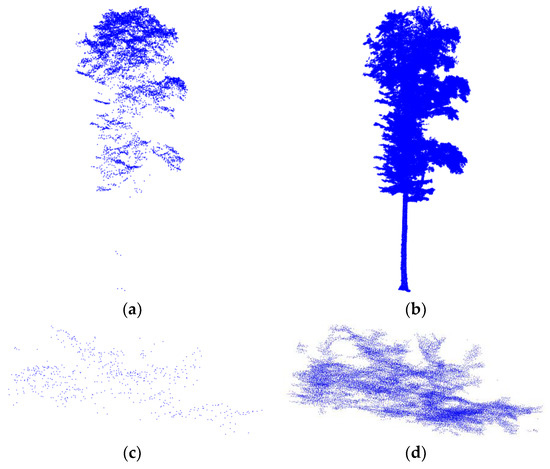 ALS and TLS tree and shrub point cloud. (a) Automatically extracted ALS tree point cloud. (b) Manually annotated TLS tree point cloud. (c) Automatically extracted ALS shrub point cloud. (d) Manually annotated TLS shrub point cloud.