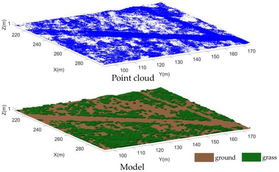 where di represents the distance from the i-th point in the grid to the fitted 3D plane, and n is the number of points in the grid. A threshold of 0.1 m is set. If the standard deviation is greater than the threshold, it is determined that there is grass in the grid, and the height of the grass model in the grid is set to σ; otherwise, the grid is determined to be bare ground. Spatial interpolation is used to construct a ground model from the ground points. For grids containing grass, a 3D grid model corresponding to the grass height is constructed and placed on the top of the ground model. Finally, the ground–grass model is constructed, as shown in Figure 4. This method is applicable for grass height extraction in any terrain.