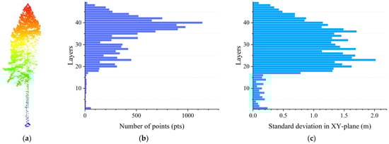where l represents the layer number. Finally, vertical distribution histograms of point counts and dispersion (Figure 5b,c) are obtained. A smaller standard deviation indicates a more concentrated point cloud in that layer. Starting from the lowest layer, the point count and standard deviation are checked against set thresholds to identify the starting elevation of the tree crown, thus achieving the separation of trunk and crown points.