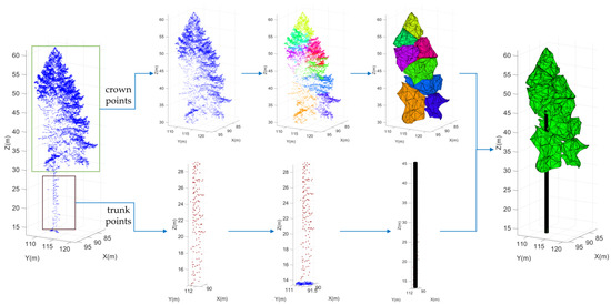 The 3D reconstruction of a tree includes the reconstruction of the tree trunk and tree crown. It is mainly divided into three parts, as follows: