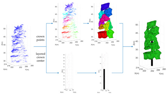 (2) Trunk modeling. For each tree, the number of trunk points and the height range are analyzed. If the number of trunk points exceeds 10, and the height range is greater than 3 m, the trunk model is fitted using the trunk points (Figure 6). Specifically, Principal Component Analysis (PCA) [39] is first used to calculate the main direction of the trunk. Then, the trunk points are projected onto the ground along this main direction, and the RANSAC [37] algorithm is applied to fit a circle on this plane. The center of this circle represents the trunk position, and the trunk cylinder model extends from the ground to the crown center. If the number of points is less than 10 or the height range is below 3 m, it is determined that the trunk information is missing. In this case, use a hierarchical canopy point fitting method to predict the trunk position (Figure 7). This involves calculating the center position of each crown layer and fitting the trunk direction through these centers, extending it to the ground to obtain the trunk’s position and height. The trunk model is then constructed based on the predicted trunk direction and position.