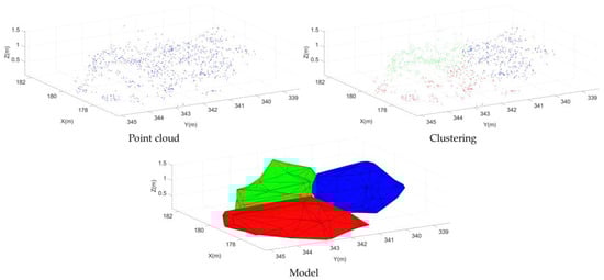 Shrubs are characterized by multiple branches and leaves, no obvious main trunk, and a single-layer canopy that is low and wide. Therefore, this study constructs the shrub model directly from the extracted shrub point cloud. First, the mean-shift algorithm [40] is used to cluster the shrub point cloud. Then, multiple 3D α-shape envelopes are generated from the clustered point cloud to construct the shrub models, as shown in Figure 8.