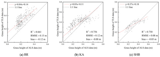 Figure 9 shows the validation results of grass models in three sample plots within the study area. The R2 values are all higher than 0.661, the bias values are all negative, and the RMSE ranges from 0.08 m to 0.15 m. This indicates that there is a certain correlation between the grass heights extracted from airborne and terrestrial LiDAR point clouds. However, the heights extracted from airborne LiDAR are generally lower than those from terrestrial LiDAR. This discrepancy is due to the upper canopy and shrub coverage, which results in fewer grass points being captured by airborne LiDAR. In contrast, terrestrial laser scanning can capture more comprehensive information about the forest understory structure. Among the three sample plots, the SHB plot has the highest accuracy and the smallest bias for grass heights (RMSE = 0.08 m, bias = −0.05 m), which may be related to the higher point cloud density (108 pts/m2) in this plot.