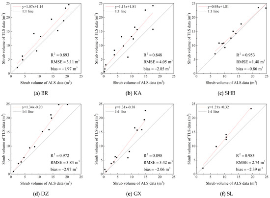Figure 10 shows the volume validation results of shrub models in six sample plots within the study area. The R2 values are all higher than 0.848, indicating a general consistency between shrub volumes extracted from airborne and terrestrial LiDAR point clouds. The bias values are all negative, and the RMSE ranges from 1.48 m3 to 4.05 m3. This discrepancy is due to the upper canopy blocking the scan of lower shrubs, causing a slight underestimation of shrub volume by the airborne LiDAR.