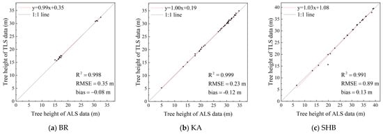Figure 11 shows the validation results of tree height in three sample plots within the study area. The R2 values are all higher than 0.991, and the RMSE ranges from 0.23 m to 0.89 m, indicating a high consistency between tree heights extracted from airborne and terrestrial LiDAR point clouds. The tree height accuracy for the SHB plot is relatively lower (R2 = 0.991, RMSE = 0.89 m, bias = 0.13 m) because terrestrial laser scanning has difficulty accurately capturing the tops of the trees. In contrast, in the BR and KA plots, a tilted bracket was used for terrestrial laser scanning, allowing for the close-range capture of the tree tops, resulting in higher validation accuracy.