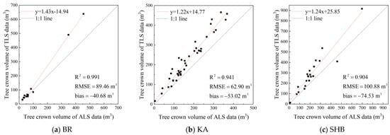 Figure 12 shows the validation results of tree crown volumes in three sample plots within the study area. The R2 values are all higher than 0.904, indicating a high consistency between the tree crown volumes extracted from airborne and terrestrial LiDAR point clouds. The bias values are all negative, and the RMSE ranges from 62.9 m3 to 100.88 m3, indicating an underestimation of tree crown volumes extracted from airborne LiDAR point clouds. This underestimation is due to the sparsity of the lower layer of tree crown points captured by airborne laser scanning.