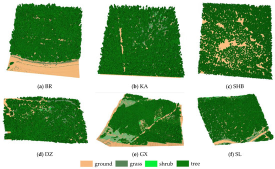 Figure 13 shows the results of the 3D forest scene model reconstruction for the six study plots. The total volumes of trees, shrubs, and grass in each scene are summarized in Table 7. It can be observed that the KA plot has the highest vegetation volume, reaching 687,645.62 m3, which is related to the higher vegetation coverage and average tree height of this plot. In the SHB plot, the combined volume of shrub and grass only accounts for 2.96% of the total volume, while the proportions for other plots are higher than 6.84%. This discrepancy is due to the fact that the SHB plot is an artificial forest, while the other plots are natural forests.