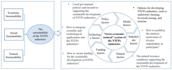 Drawing from the systems perspective proposed by “social-ecological” systems theory and integrating the “social-economic-natural” composite ecosystem theory and political ecology theory, this paper presents a case analysis framework for the sustainability models of the non-timber forest products industry. Specifically, the sustainable development of this industry is conceptualized as a “socio-economic-natural” system. The impacts on the sustainable development of the non-timber forest products industry can be categorized into three aspects: (1) social sustainability (e.g., poverty reduction, protection of unique forest products), (2) economic sustainability (e.g., sustainability of products and market sales), and (3) natural sustainability (e.g., natural endowments, protection of forest resources). This paper identifies six key factors most relevant to the sustainable development of these industries from these three aspects: policy factors, model factors, technology factors, stakeholder factors, funding factors, and natural factors. Policy factors refer to the local government’s support and incentives for exploring sustainable development in this industry; model factors pertain to the choice of development models such as forest undergrowth cultivation, farming, and tourism; technological factors address how to apply scientific and technological advancements to the sustainable development of this industry; stakeholder factors involve stimulating the internal motivation of diverse participants; funding factors focus on acquiring financial support for sustainable development; and natural factors relate to the natural resources supporting the sustainable development of this industry. Overall, advancing the sustainable development of this industry faces three core issues: first, governments need to improve policy frameworks to guide sustainable development; second, mechanisms for sustainable development must be established to optimize resource allocation; and third, broad mobilization of various stakeholders is required to enhance their internal motivation (see Figure 2).