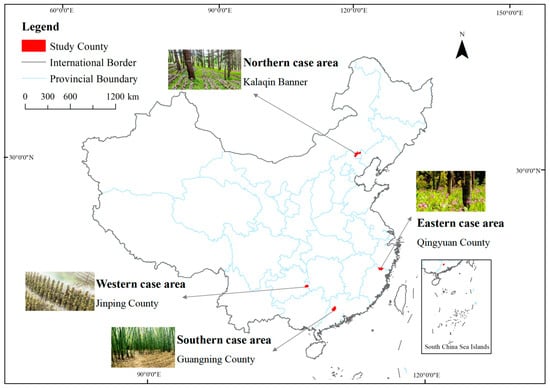 To ensure the representativeness of the cases, this study selected four county-level cases in China focusing on the sustainability of non-timber forest products industries: Jinping County in Guizhou Province (western case), Guangning County in Guangdong Province (southern case), Qingyuan County in Zhejiang Province (eastern case), and Kalaqin Banner in Inner Mongolia (northern case). The selection of these four cases was based on the following considerations: First, all four case-study areas were counties, which were comparable in China’s administrative divisions, providing good comparability for policy tools. Second, with the exception of Qingyuan County in Zhejiang, which was a provincially underdeveloped county, the other three counties were designated as “nationally impoverished counties” by the Chinese government, aligning with the study’s focus on “underdeveloped counties”. Third, these four cases represented exemplary practices in the exploration of these industries in Chinese counties. They had demonstrated notable sustainability in ecological protection, social poverty alleviation, and agricultural economic development, and had been recognized as provincial or national “Demonstration Bases for non-timber forest products Industries”, offering valuable insights for research on sustainable development models for these industries. Fourth, these four case-study areas were located in the western, southern, eastern, and northern regions of China. The natural endowments and economic conditions of these areas varied significantly, leading to notable differences in the development models of the industry. This variation facilitated the differentiated analysis and comparison (see Figure 3 and Table 1).