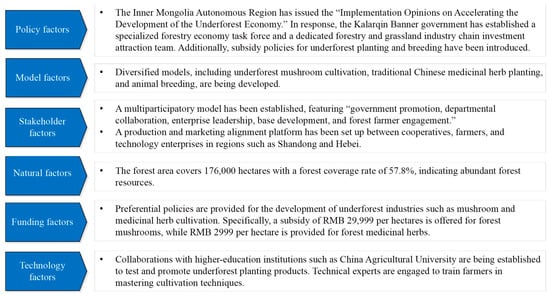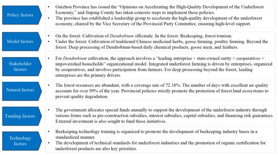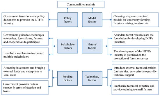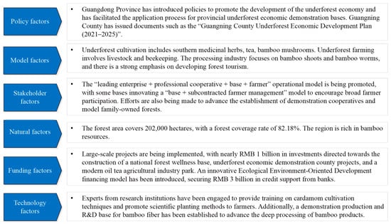Comparative analysis indicates that the sustainable development of the non-timber forest products industry typically faces certain obstacles. It requires the leading entities to strategically manage six key elements: policy, model, stakeholders, nature, funding, and technology. These elements exhibit distinct common characteristics (see Figure 8). Policy factors: in all four cases, county governments have provided policy guidance to promote the development of this industry, thereby energizing local economic growth. Model factors: each case utilizes the unique characteristics of local forest resources, focusing primarily on underforest cultivation while also incorporating diversified economic models such as underforest livestock farming and forest tourism. Stakeholder factors: all four cases have effectively mobilized a range of stakeholders, including farmers, cooperatives, enterprises, and forest farms, and have emphasized mechanisms to align the interests of these diverse participants. Natural factors: the sustainable development of this industry relies on abundant forestry resources, with a focus on developing underforest products while conserving these resources. Funding factors: each case has diversified its funding sources by leveraging various channels, including investment attraction funds, bank loans, tax incentives, and social capital. Technology factors: all four cases recognize the critical importance of technological advancements for the sustainable development of this industry. Governments or enterprises provide support to smallholder farmers in areas such as breeding and technical training, thus guiding the development of this industry.