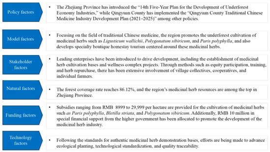 The four cases exhibit notable differences in location, natural endowments, and external institutional contexts, leading to varying models of non-timber forest products industry development. Disparities are observed across the six key elements: policy, model, stakeholders, nature, funding, and technology (see Table 2). (1) Policy factors: All four cases have implemented policies to promote the development of the underforest economy. In the southern and northern cases, specialized teams were established within the government to specifically support the industry activities. (2) Model factors: The western, southern, and northern cases feature highly integrated non-timber forest products industries, encompassing underforest cultivation, livestock farming, and tourism. In contrast, the eastern case primarily focuses on the medicinal herb industry chain. (3) Stakeholder factors: In the western and eastern cases, large external enterprises play a leading role, driving the involvement of cooperatives, farmers, and local businesses. Conversely, the southern and northern cases are primarily driven by local enterprises or large local operators. (4) Nature factors: The four cases differ in terms of forest tree species, geographical location, and climate, leading to significant variability in suitable non-timber forest products industries. This results in diverse industry models for cultivation and livestock farming. (5) Funding factors: The western and eastern cases primarily rely on external investment for funding, while the southern case raises funds based on key projects. Government subsidies for this industry’s development are provided in the western, eastern and northern cases. (6) Technology factors: The western, southern and northern cases involve the introduction of external research institutions or experts to provide technical training for underforest activities. The eastern case, however, relies on stringent planting standards established by leading enterprises in the medicinal herb sector.