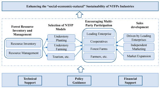 To enhance the sustainability of the non-timber forest products industry, it is essential to optimize across these six elements from a “social-economic-natural” sustainability perspective. This includes “leading with policies and guiding the non-timber forest products industry development from a management level”, “choosing appropriate development models based on local natural endowments and socio-economic development foundations”, “fostering multi-stakeholder benefit linkage mechanisms primarily driven by large enterprises”, “focusing on the technological research and development of the non-timber forest products industry and establishing technical training mechanisms”, and “primarily utilizing market funds and improving the sales market for the non-timber forest products”.