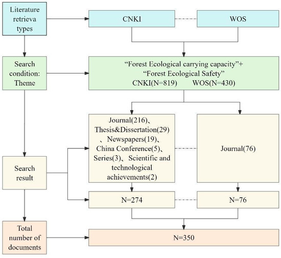 A literature search was conducted using databases such as CNKI (China National Knowledge Infrastructure) (https://www.cnki.net (5 March 2024)) and WOS (Web of Science) (https://webofscience.clarivate.cn/wos/woscc/basic-search (5 March 2024)). Literature searches were conducted by entering “Forest Ecological Carrying Capacity” for the first search and “Forest Ecological Security” for the second search. The search deadline was 31 December 2023. The following inclusion criteria were employed: (1) search terms should be present in at least the title, abstract, and keywords of the studies; (2) studies are included in the CNKI and WoS databases; (3) studies are related to forest ECC or ES; (4) studies are written in English or Chinese; and (5) the types of studies include journal articles and reviews, conference papers, newspapers, editorials, serials, scientific results, books, doctoral dissertations, and Master’s theses. The following exclusion criteria were applied: (1) duplication in the literature; (2) studies of non-forest ecosystems; and (3) unavailable literature.