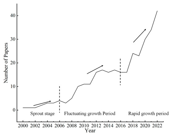 A change in the number of research studies is a significant indicator of the evolution of the research field, and can reflect the development trend in the field. Research on forest ECC and ES can be categorized into three stages, showing an overall upward trend (Figure 2). The first stage, from 2000 to 2006, saw a total of 15 articles. This initial phase had a slow start, with an average annual publication of fewer than three articles, representing the sprout stage. The second stage, from 2007 to 2016, comprised 122 articles, with an average annual publication of over 12 related studies, marking the fluctuating growth period. The third stage, from 2017 to 2023, experienced rapid growth, with a total of 213 publications, indicating the field’s significant research potential.