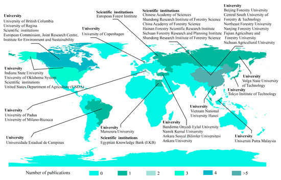The development of ECC and ES research has shown significant imbalances globally, due to differences in natural resource base and economic and social development levels among regions (Figure 12). China has stood out in this field, drawing global attention. In 2003, China’s State Council released the ‘Action Plan for Sustainable Development in the Early 21st Century’, prioritizing the sustainable use of forest resources. This policy spurred domestic scholars’ interest and investment in this research area. An analysis of the top twenty countries by forest area in 2020 indicates that the top five countries are actively researching forest ECC and ES, while countries ranked sixth to twentieth have made less progress. Interestingly, countries with smaller forest areas like Turkey, Finland, Malaysia, and Japan are actively researching in this field. This reveals the uneven distribution of research areas and suggests that perceptions of resource scarcity may influence research interests. The concentration of research efforts in countries with strong economic foundations and scientific capabilities is also evident.