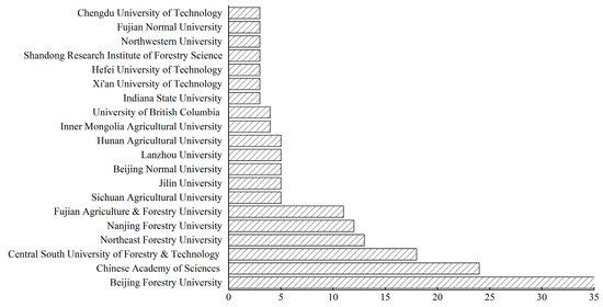 This study focuses on the top 20 publishing institutions with over two articles each (Figure 4). Analysis reveals that all institutions with over 10 articles are based in China, with the University of British Columbia (4 articles) and Indiana State University (3 articles) representing foreign institutions. The leading institutions can be categorized into two groups: universities specializing in forestry research, such as Beijing Forestry University (35 articles) and Central South University of Forestry and Technology (18 articles), and national and local scientific research institutions like the Chinese Academy of Sciences (24 articles). Additionally, forestry- and agriculture-related universities have also made notable contributions, such as Fujian Agriculture and Forestry University (11 articles). The distribution of the literature is influenced by various factors including research funding, geographical location, and academic focus.