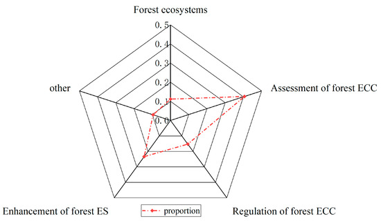This study categorizes the screened literature into five main categories: forest ecosystems, assessment of forest ECC, regulation of forest ECC, enhancement of forest ES, and other (Figure 5). The results showed that forest ecosystems accounted for 11.15% of research, focusing on their structure and function. The assessment of forest ECC literature is the most abundant, reaching 40.58%, covering indicator screening, system construction, and innovative evaluation methods. The regulation of forest ECC literature accounts for 15.32%, with a focus on exploring the internal regulatory mechanisms of forests; the enhancement of forest ES literature accounts for 23.42%, mainly related to the construction of ES patterns; and the rest belongs to other. This classification reveals the mature trend in the assessment of forest ECC research, while the fields of regulation of forest ECC and enhancement of forest ES are still actively exploring and developing.
