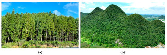 Following the mitigation of KD in karst areas, the vegetation pattern has been enhanced to optimize the forest ecosystem (Figure 6). The introduction of tree and broad-leaved species, including Cupressus duclouxiana Hickel 1814 and Koelreuteria bipinnata Franch 1886, into plantation areas serves to balance the structure of the forest stand, thereby taking into account both ecological and economic benefits [36]. This approach has significantly improved the provision of forest ecosystem services, contributed to the restoration of natural ecosystem stability and integrity, and ultimately strengthened the overall ECC.