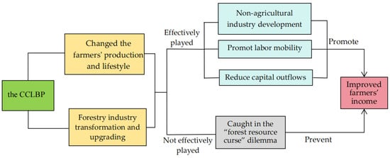 Income is a key factor in the improvement of people’s livelihoods and quality of life [6] as well as a determinant of the quality of life of individuals and families [7]. Individual and family income levels are often influenced by political and institutional factors [8]. The government formulates and enforces the CCLBP to control human exploitation and demand for natural forests. The implementation of the CCLBP has brought about a change in farmers’ production and lifestyle as the main participants, profoundly impacting on farmers’ income. It has been a major policy objective in recent years to promote the ecological benefits of the CCLBP and the effect of increasing farmers’ income. The contribution of the CCLBP to improving the ecological situation cannot be denied [9,10,11], but will such intensive policy implementation fall into the dilemma of the “forest resource curse” of “rich forest resources but slow economic growth”, thus preventing an increase in farmers’ income? Or will it bring new development opportunities and livelihood capital to farmers, thereby increasing farmers’ income? How does the CCLBP increase farmers’ income? It is important to explore these issues.