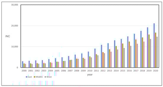 Figure 2 shows the changes in farmers’ income across different regions of China from 2000 to 2020. Overall, farmers’ income shows a gradual increasing trend, with the highest income observed in the eastern regions, followed by the central regions, and then the western regions. In terms of fluctuation amplitude, the fluctuations in the eastern and central regions are smaller than those in the western region. The possible reason is that the rural economic development in the eastern and central regions is relatively mature, with relatively perfect rural infrastructures, and farmers’ income is growing steadily. In general, there exists uneven development in farmers’ income among different regions in China, and the development gap between the eastern, central, and western regions still exists.
