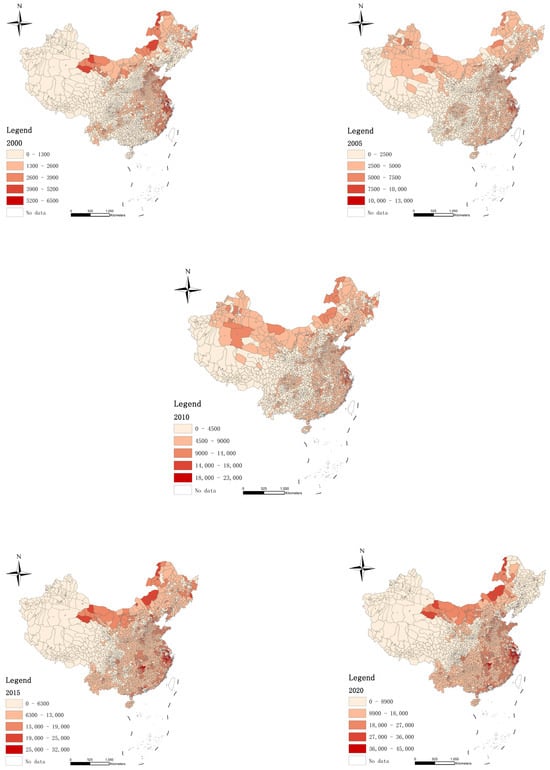 This study is based on data collected from various sources including the National Bureau of Statistics of China, official websites of county governments, and annual publications such as the “China Rural Statistical Yearbook”, “China Agricultural Statistical Yearbook”, and “China County Statistical Yearbook” for the years 2000 to 2020. A panel dataset covering 2843 counties from 31 provinces, autonomous regions, and municipalities directly under the central government was constructed. The dataset excludes regions in Hong Kong, Macao, and Taiwan. For areas that underwent renaming or reorganization into districts during the study period (2000–2020), they were treated as the same unit. Missing data were filled using the linear interpolation method.