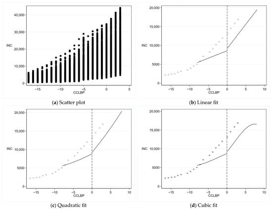 When using the RDD for testing, it is first necessary to determine whether there is a jump phenomenon in the dependent variable at the breakpoint, that is, the breakpoint effect. Figure 4 shows the scatterplot and fit situation of farmers’ income before and after the implementation of the CCLBP. It can be seen that the scatterplot, linear fit, quadratic fit, and cubic fit all show significant jumps on both sides of the breakpoint, indicating that farmers’ income at the breakpoint increases significantly due to the policy effect. Thus, it can be inferred from the breakpoint effect that the implementation of the CCLBP has a significant impact on farmers’ income.