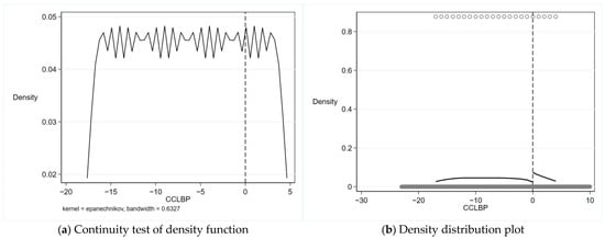 The local randomization assumption requires that the driving variables are not subject to potential human manipulation. If their response to policy interventions is largely influenced by human manipulation, the final estimation results will be biased. To examine the potential manipulation of individual driving variables near the breakpoint, the following tests were conducted in this study. First, we tested the continuity of the density function of the driving variables [58]. As shown in Figure 5a, there is no significant difference in the density function of the distribution of driving variables on both sides of the breakpoint. Second, we used local polynomial density estimation (local quadratic approximation) to test for discontinuities in the breakpoint regression estimates and plotted the corresponding density functions (Figure 5b), following Cattaneo et al. [59]. From Figure 5b, it can be seen that the change in the driving variables at the breakpoint is relatively smooth. The results of the above tests indicate that there is no evidence of manipulation in the selection of the driving variables.