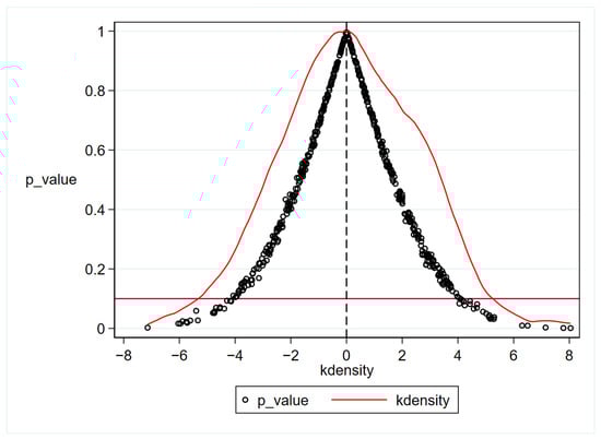 To mitigate the estimation bias resulting from non-random sample selection and ensure that the effect captured in this study is indeed attributable to the CCLBP, we conducted a placebo test following the approach outlined by Baker [61]. Since the “pseudo” treatment group is generated randomly and does not have a significant effect on the explained variable, its estimated coefficient should be near 0. Figure 6 depicts the kernel density distribution of the regression coefficients of the CCLBP on farmers’ income from 1000 placebo estimations. As shown, the results exhibit a symmetric inverted U-shaped distribution centered around 0, resembling a standard normal distribution. This suggests that the coefficients estimated in the 1000 random processes are indeed concentrated around 0. Therefore, we can reasonably conclude that the results of the baseline estimation are not affected by non-random sample selection bias, providing evidence for the credibility of our research findings.