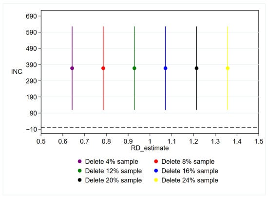 The motivation for manipulation being stronger for samples closer to the breakpoint may affect the estimation results of this study [62]. Therefore, this study removed samples within 4%, 8%, 12%, 16%, 20%, and 24% around the breakpoint and conducted a donut hole RDD test. Figure 7 shows the regression coefficients and 95% confidence intervals. It can be seen that even after removing up to 24% of the samples, the regression results remain robust.