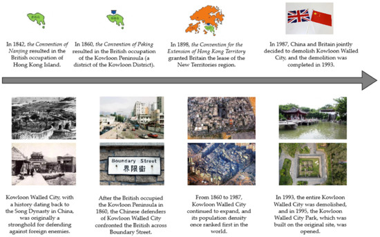 Kowloon Walled City Park before and now (the above pictures come from the Internet (https://image.baidu.com (accessed on 22 July 2024)) and have been reassembled by the author).