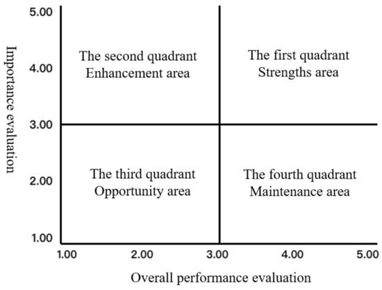 The importance–performance analysis (IPA) model is a widely used tool in various industries to prioritize service quality attributes and evaluate performance. In a recent study, it is also used in the land governance area [42,43]. In this study, the IPA model was employed to gauge and evaluate the overall perceptions of the different areas of Kowloon Walled City Park. The IPA model was divided into four quadrants, which were analyzed based on the importance scores (1–5 indicating very unimportant–very important) and overall performance scores (1–5 indicating worst performance–best performance). The results of respondents’ integrated perceptions can be categorized as follows: (1) The first quadrant is the Strengths area, where respondents believe that the factors in this area are very important and their performance is good; (2) The second quadrant is the Enhancement area, where respondents believe that the factors in this area are also very important, but their performance is not ideal and they need to focus on fixing and improving them; (3) The third quadrant is the Opportunity area, where respondents believe that the factors in this area are not vital and their performance is relatively poor. However, this does not mean that the factors in this zone can be ignored, but extra attention should be paid to the analysis of the causes and finding new breakthroughs to improve respondents’ satisfaction; (4) The fourth quadrant is the maintenance zone, where respondents perceive the importance of the factors in this zone to be low, but their performance is relatively good, so capturing these factors can have a positive effect. In terms of the measurement of the IPA model, this study used a five-point Likert scale to measure respondents’ perceptions of the performance and importance of the different zones in Kowloon Walled City Park, as shown in Figure 3.
