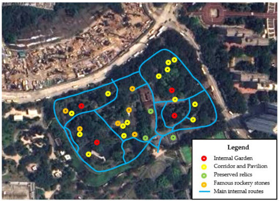 On the other hand, in the process of renovating Kowloon Walled City Park, eliminating the original unfavorable factors of Kowloon Walled City as much as possible is also one of the main tasks. Therefore, the idea of renovating Kowloon Walled City has never been rigidly repairing the old but has rather been based on demolishing old buildings, preserving historical relics, and building new city parks; the goal is innovatively adopting a variety of methods to retain as much as possible the memory of the history of Kowloon Walled City. Figure 6 shows the spatial relationship between the main roads and the main attractions within the Kowloon Walled City Park. The red circles indicate the main attractions inside the park, including stone monuments, rockeries, and water pavilions, while the blue lines indicate the main roads inside the park. It can be seen that the attractions of Kowloon Walled City Park are generally designed to be situated on both sides of the park roads and the surrounding areas, with some of the roads being designed based on the location of historical sites and some of the roads being designed according to the overall design of the park. In addition, the various attractions tend to be the most popular areas of the park, as well as relatively crowded areas. Therefore, the design of roads in the park is a comprehensive project; in addition to connecting various types of attractions, it also considers how to meet the needs for rest, recreation, and other aspects. Whether users’ needs are adequately met can also be tested by their feedback on perceived preferences to see if the Kowloon Walled City Park has achieved a good balance between naturalness and socialism.