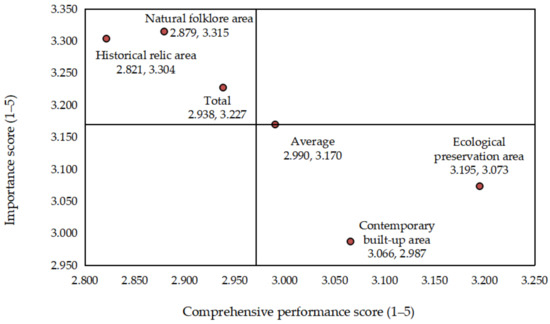 In addition, respondents’ perceived preferences for the four types of areas within the Kowloon Walled City Park are also based on their evaluation of the importance and performance of every type of element within the park. As shown in Figure 7, the average IPA points for the natural folklore area and the historical site area lie in the second quadrant in the upper left corner, which means that respondents consider the elements in this area very important, but their performance is not satisfactory, so emphasis should be put on restoration and improvement. For example, some immovable, irreproducible, and easily damaged historic sites should be protected in a more complete and scientific way; for the display of historical artifacts, innovative ways and means should be adopted to achieve better preservation and utilization. Moreover, the average IPA points for the contemporary built-up area and the ecological conservation area lie in the fourth quadrant in the lower right corner, and the interviewees think that the factors in this area are of low importance, but their performance is good. For example, compared to historic sites, buildings in the contemporary built-up area do not carry conservation value in the historical sense but take the roles of displaying cultural relics and providing public services. Similarly, compared to the chaotic state of the Kowloon Walled City prior to its demolition, the current ecological conservation area, with its large areas of mountains, water, lakes, and grasslands, takes on the role of maintaining the natural environment of the park and providing various types of ecological services. At present, these two areas are comprehensively performing well, and making full use of these factors in the next step can play a more positive role.