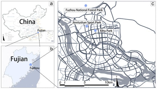 (a) Location of Fujian Province in China map; (b) Location of Fuzhou City in Fujian map; (c) Study site selection of urban forests in Fuzhou.