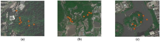 (a) Plots of Jinniushan Sports Park. (b) Plots of Fuzhou National Forest Park. (c) Plots of Xihu Park.