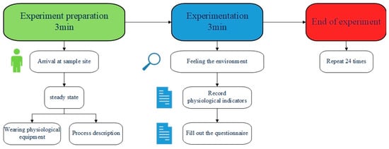 During the specific physiological indicator detection experiment, participants were fitted with calibrated physiological monitoring devices and instructed to avoid talking, eating, or drinking while experiencing the environment at the observation site for a duration of 3 min. This measure was taken to minimize artificial interference during the experiment. The experimenters were tasked with the real-time recording of participants’ physiological indicator data. Following each site visit, participants completed the pertinent questionnaire survey. A detailed illustration of the experimental procedure is provided in the attached Figure 4.