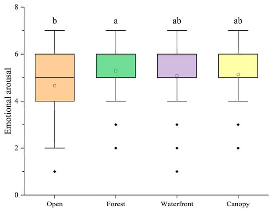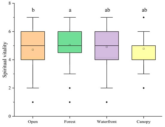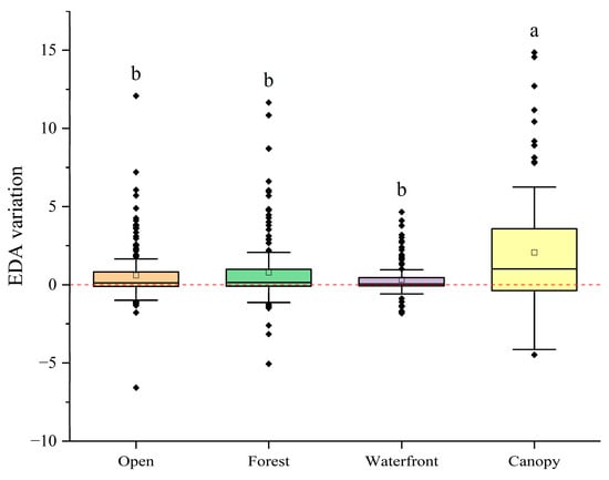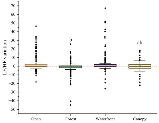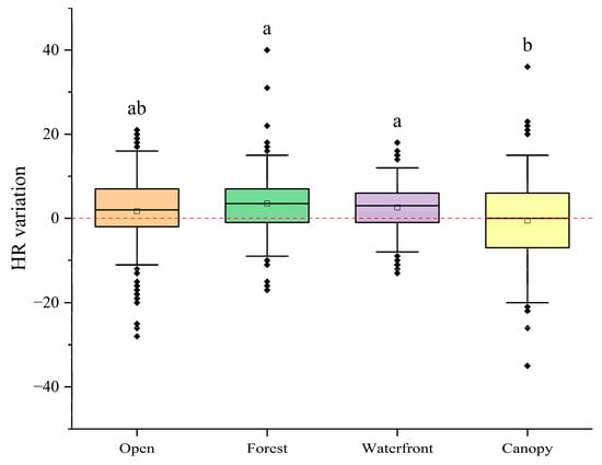 Variance of HR in different types of recreation places. Different lowercase letters (a,b) represent significant differences in HR variation between different recreation places (p < 0.05).