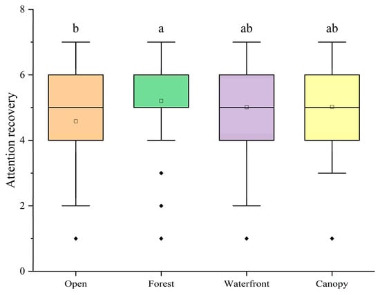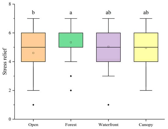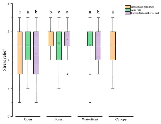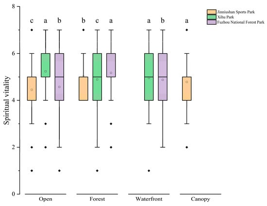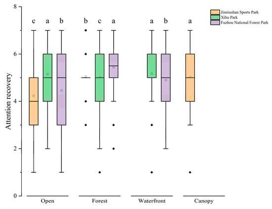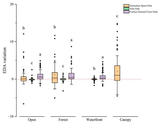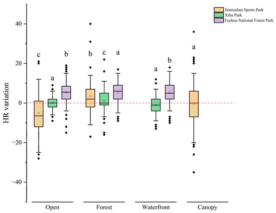 Variance of HR in different types of recreation places in parks. Different lowercase letters (a–c) represent significant differences in HR variation between different recreation places (p < 0.05).