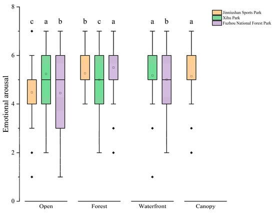 On the effect of different recreation places in different park types on HR variability, the results showed that there were significant differences in the effects of different places in different park types on HR (Figure 6). For example, in open recreation places, the effects of different parks on heart rate were different, and only the HR in Jinniushan Sports Park changes negatively.