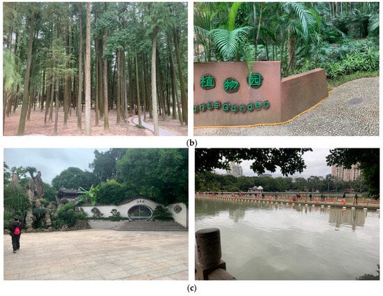 In Jinniushan Park, Canarium album, Dimocarpus longan, and Phyllostachys sulphurea are the dominant tree species. In Fuzhou National Forest Park, trees like Ficus microcarpa, Archontophoenix alexandrae, and Bauhinia blakeana are the primary ones. In Fuzhou Xihu Park, there are many Osmanthus fragrans, Prunus persica, Lagerstroemia indica, and Salix matsudana Koidz planted. The selection of these parks is based on their diversity in type, function, and visitor experience, which enable us to provide a comprehensive perspective on the impact of urban trees on public health. The specific locations of the parks are shown in detail in Figure 1.