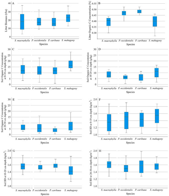 Boxplots showing the absence of outliers for the primary variables litter biomass panel (A), C content of litter panel (B), SOC concentration at the three depths assessed (0–10 in panel (C), 10–20 in panel (D), and 20–30 cm in panel (E)), and respective soil bulk density at each assessed depth (0–10 in panel (F), 10–20 in panel (G), and 20–30 cm in panel (H)).
