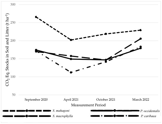 The periodic dynamics of stocks in both litter and soil pools, summed up and expressed in CO2 Eq. units, were examined using one-way RMA for each species, considering the four measurement periods (September 2020, April 2021, October 2021, and March 2022). The sphericity assumption was met for these four variables as assessed by Mauchly’s test (Table 6). Post hoc analysis with a Bonferroni adjustment (Table 7) revealed that in both litter and soil pools considered together, there were statistically significant differences in CO2 Eq. stocks under P. caribaea (p = 0.001). However, no differences were observed in the CO2 Eq. stocks of S. macrophylla (p = 0.172), P. occidentalis (p = 0.151), and S. mahagoni (p = 0.161) stands.